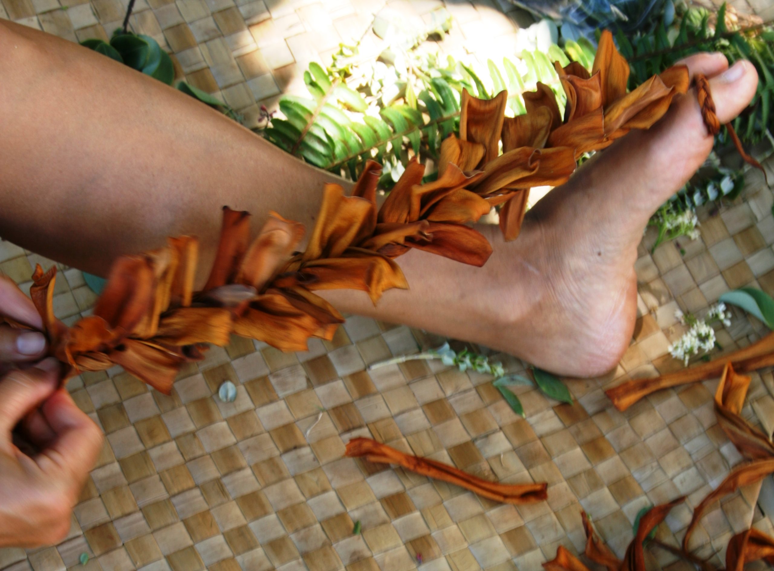 ‘Ulu (breadfruit) trees begin bearing fruit in 3 to 5 years, and are productive for many decades. The starchy, potato-like, fruit is harvested when firm and exuding sap. At that stage, it can be made into a variety of tasty dishes. Breadfruit is a great source of calcium, and is high in vitamins A and B. The trunk can be used for making pahu (drums), papa he‘e nalu (surfboards), and papa ku‘i ‘ai (poi pounding boards). Medicinally, a remedy to treat koko‘ino (bad blood) was made with ‘ulu, and the sticky latex was used as glue to caulk canoes and to catch birds. Yellow, tan and brown kapa dyes can be made from the male inflorescence of ‘ulu. Traditionally, `ulu is planted at the birth of a child to provide a life-time of food.